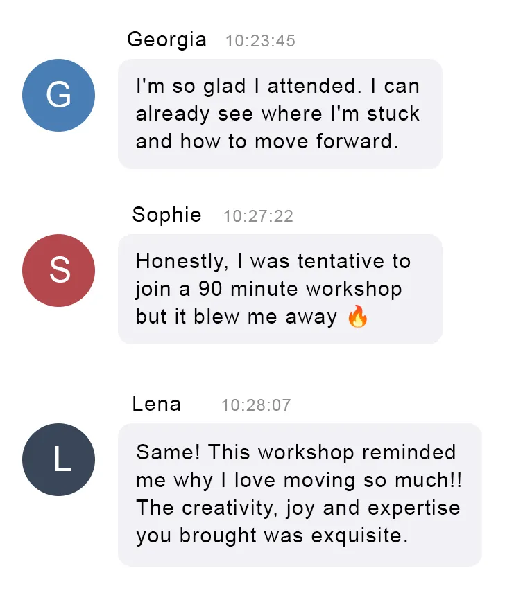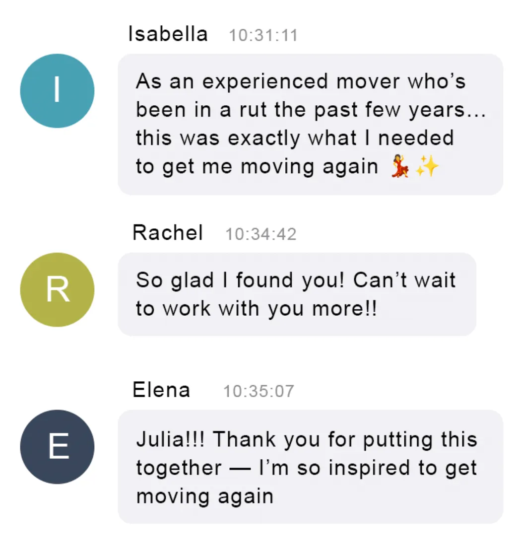 I thought I just needed more motivation. But Julia helped me see that what I really needed was permission to stop outsourcing how I move. AND to know where in my body to find said motivation. This workshop gave me so many aha moments I could cry.